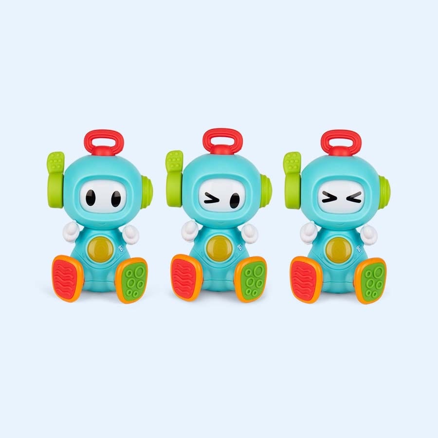לאחר לחיצה או משיכה של כף הרגל של הרובוט, הילד ישמע צלילים שונים או מנגינה שמחה ויראה אור מהבהב. ראשו של הרובוט משמיע צליל מקשקש בזמן שהוא מצלם, והידיות מפיקות צלילים כשהם מורמים ומתחילים את האור על הבטן. כשאנחנו מעלים את הצעצוע, האור נדלק והרובוט מנגן מנגינה שמחה. צבעים ומרקמים שונים מעוררים את חושי הילד.